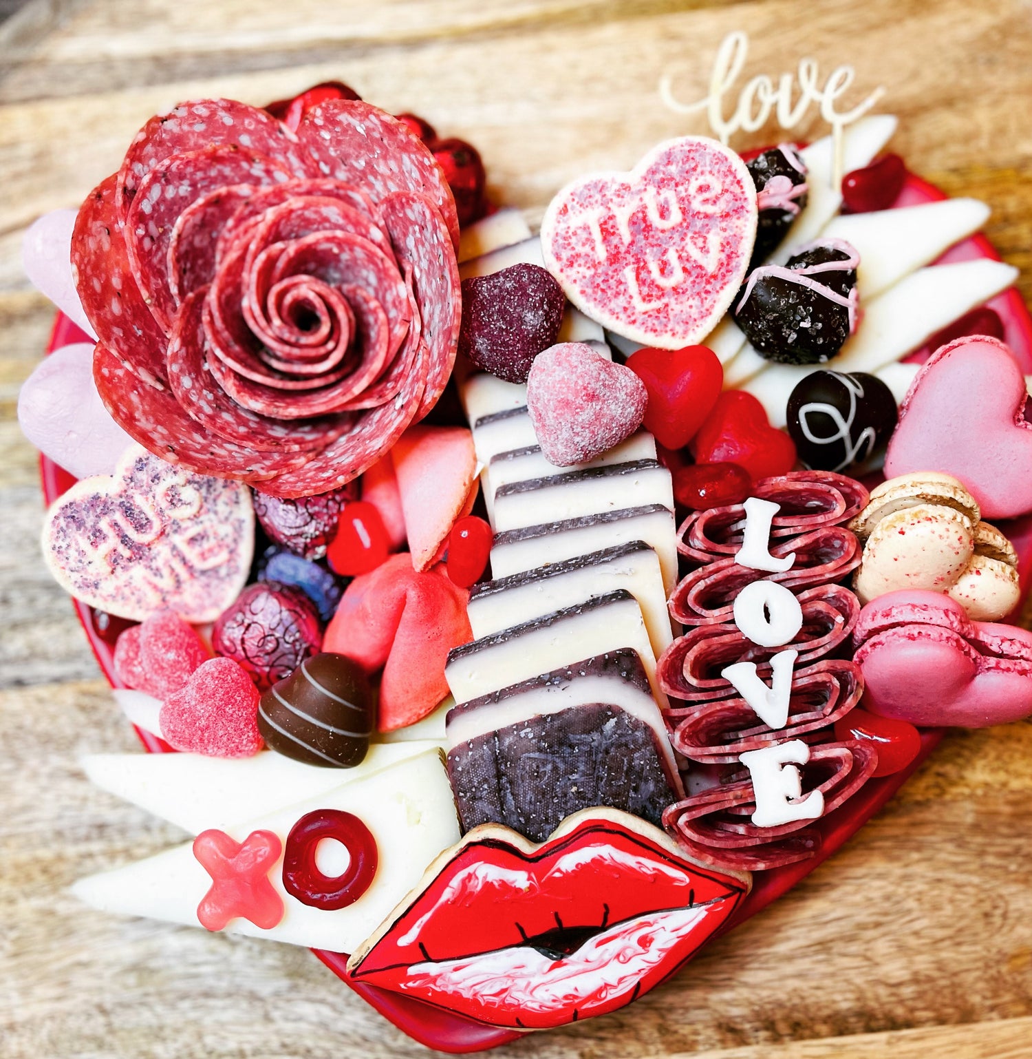 Charcuterie and Sweets board for 2 on a red heart plate that is yours to keep. Featuring delicious cookies from @3kidsandcake, a local baker.