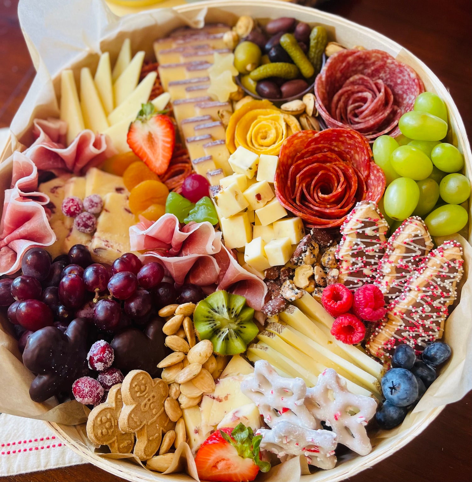 Reusable round cheese box, including 3 cheese and 3 meats, dried/fresh fruit, nuts, olives/pickles, crackers, and other accompaniments.